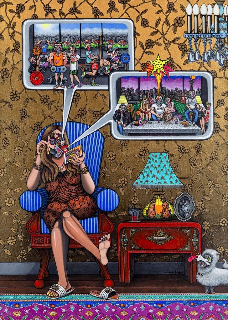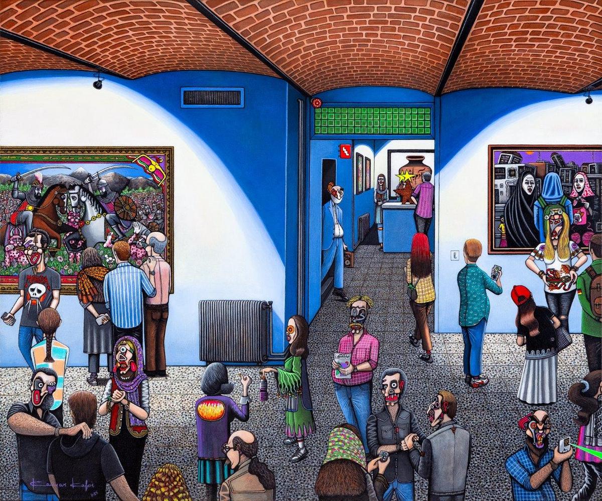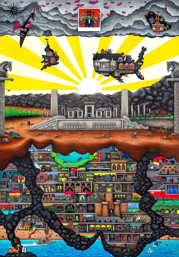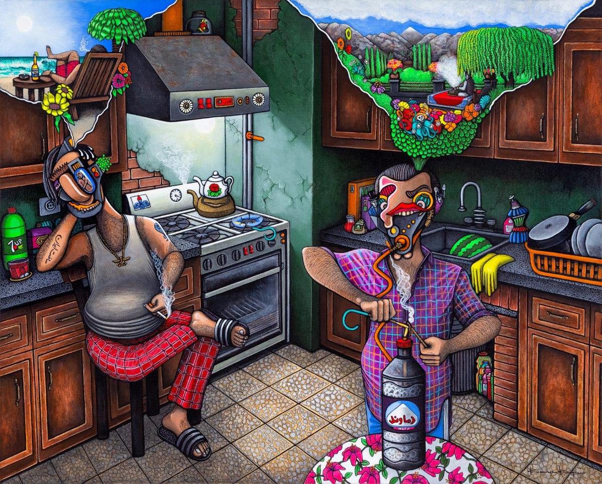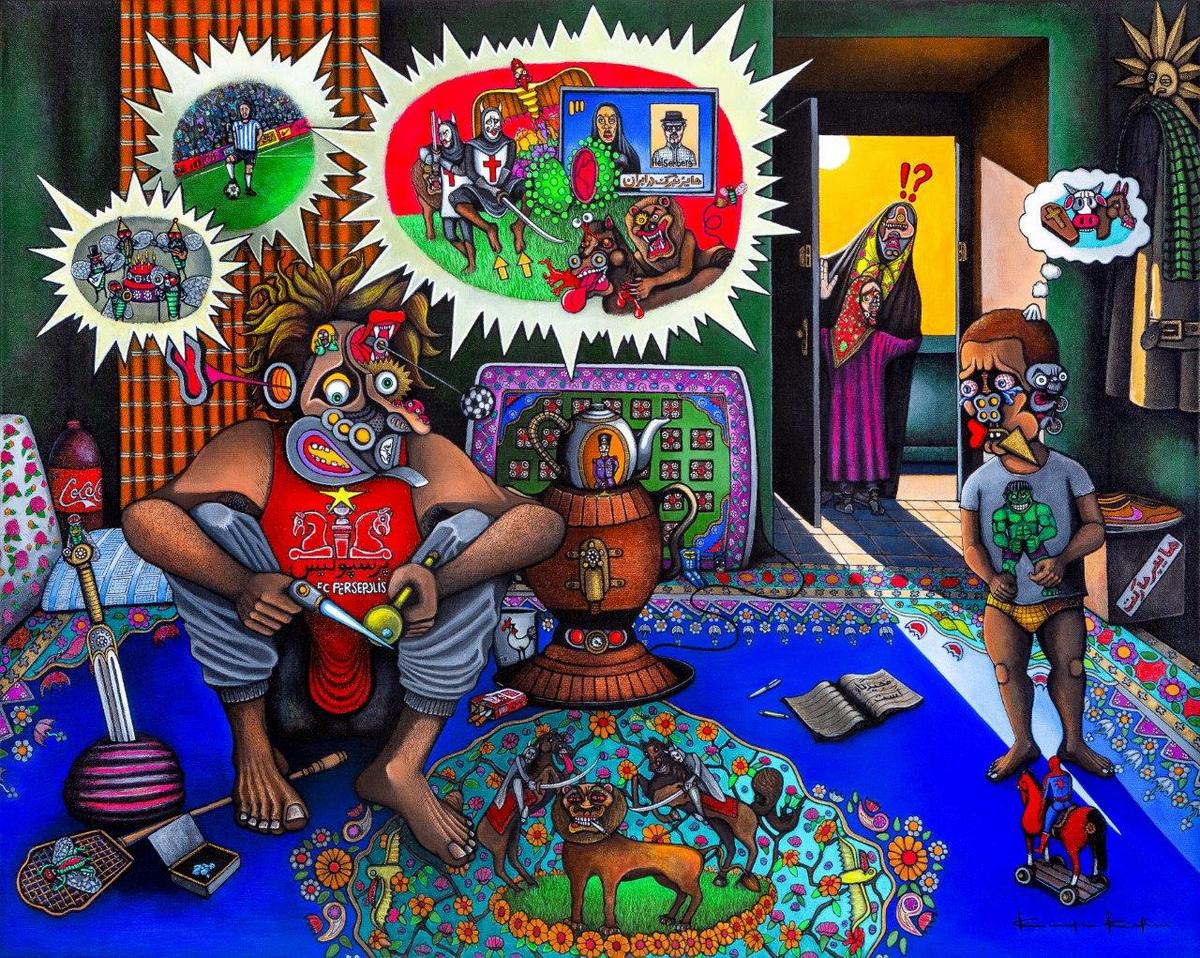 Kamyar Kafaie presents his observations on Iranian prejudices, approaches, and weaknesses through intricate visual narratives. At first glance, his works appear cheerful, vibrant, and filled with color. Yet, on closer examination, they reveal layers of decadence and dysfunction within parts of society. In this assemblage of satirical commentary, the artist holds a mirror to the collective experience, addressing themes such as social status, identity, corruption, and conspicuous consumption.